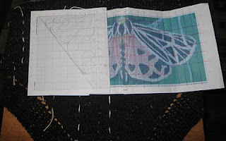 I'm working on the Virgin Tiger Moth. I have completed the head capsule and outlined the dark pattern on the thorax and abdominal segments. The number of dark markings varies from photo to photo so I did worry about an exact number. The solid red area follows the lines of the thorax and abdomen which will blend into the wings. The blue(ish) guidelines roughly determine the lower set of wings, for now. I will outline the dark spots on the wings and fill the rest with red. It's a bulky, heavy project, so I will be alternating it with smaller, portable knitting.